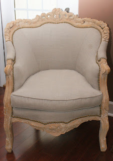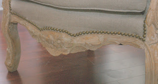 The kind of chair I’m always staring at on ebay and etsy, knowing I’ll never afford one.  I looked at the price tag just to know how outlandish it would be.  Much to my surprise, it was marked 60% off an already discounted price!!!  The owner loves to buy and sell, to recreate and she was ready for some new merchandise.  (She had a settee that matched but it was WAY out of my price range, even on sale).  I had already been debating getting a beautiful table that would be a nice size for desk/craft table, but I knew I would have to work on it.  It’s a beautiful baby blue, but that’s not for me.  It will be painted, you guessed it, white.  We asked if they could move the chair (half-way across the store) to the table’s booth to see if it would fit under it.  Doing her job well, the owner even suggested I get some little tapered feet or cut a dowel rod to fit under the clawed feet of the table to raise it up just a bit–great idea, I thought.  It turned out beautifully.  For the price of one, I not only got two, but got two rare finds at unbelievable deals. Not only that, the piece is perfect for the room.  She had it reupholstered in a gray-taupe linen, added the nail heads, and bleached the wood.  It will be such a beautiful tone against all the white in the room.   Looking at the chair literally makes me grin like a little kid.