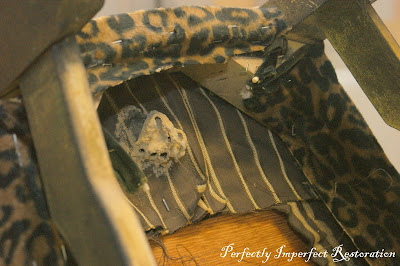 I am sure I was not supposed to laugh, but your post cracked me up. I quite agree with you about the animal print. The stripes and ric rac would have been fine, but to add the animal print. Um, no thanks. Since Darla had mud dobber nests, the poor gal must have been left out in the elements. I cannot wait to see what you have in store for her. I am sure she will be quite beautiful once you have completed her makeover.