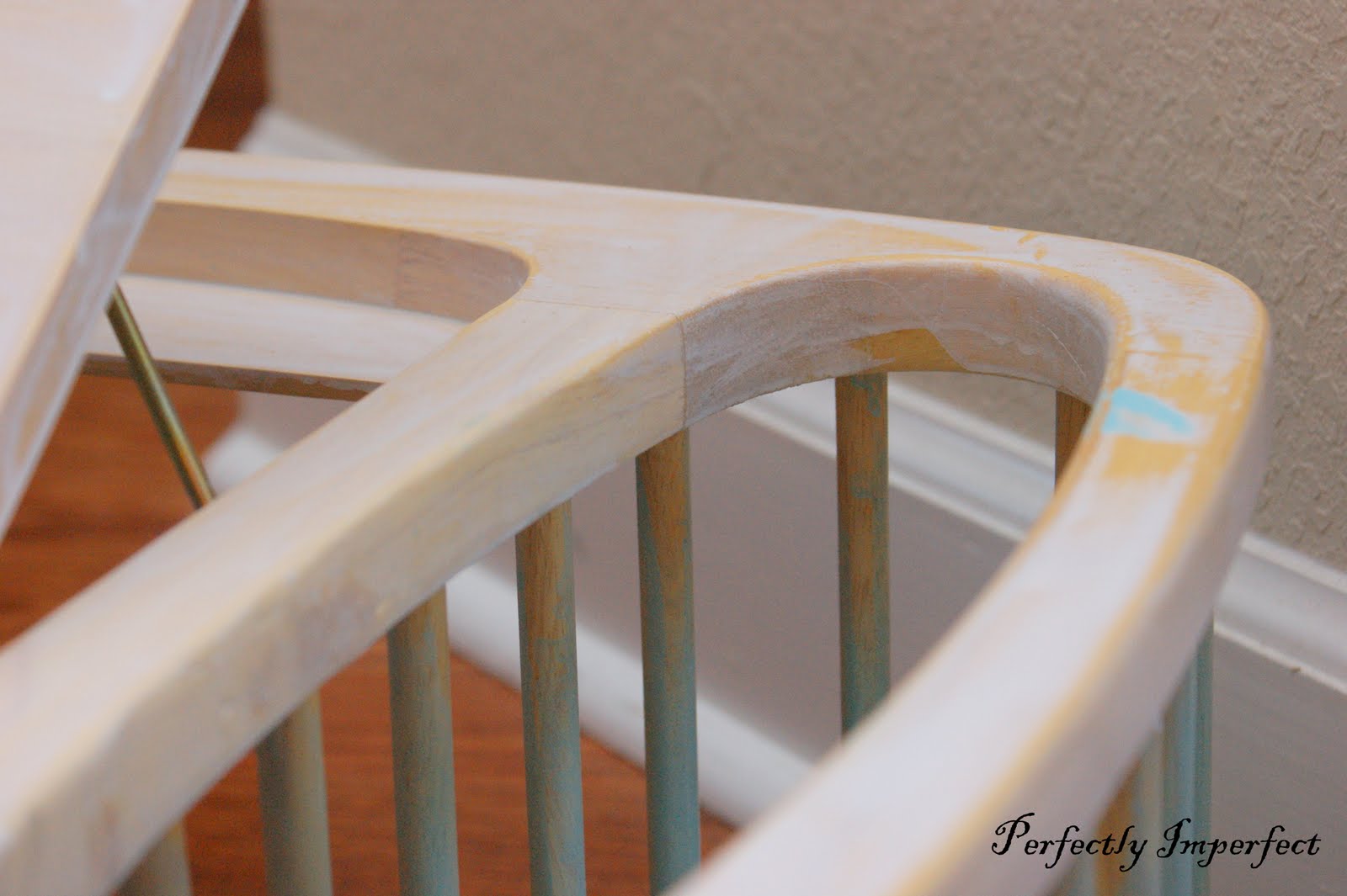 I do love the way it looks like I just left it outside for a long time. First, I watered down my latex paint with water….then washed a coat on the bottom half. After painting all those dowels, I decided I was nuts. So when it dried, I spray painted the bottom half a turquoise that will match the wall color. After it dried, I used a 320 grit sanding block to age it and thin the paint.