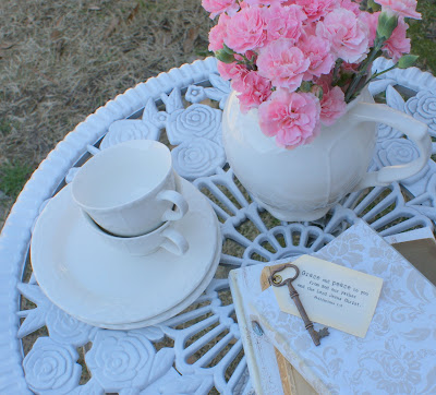 Isn’t that soooo much better??? I want to spend time at that table, drinking my morning coffee or watching Gray play outside. We know I’m in serious love with white, but I truly feel like it was the perfect pick-me-up for the set…and it brings out the detail so much more. Roses are supposed to go with white, right?