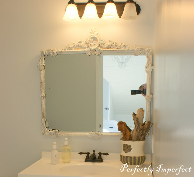 Hello sweet Shaunna – oh how I love the way that mirror looks in your bathroom! It's fabulous! I have two bathrooms that have the very plain builder's mirror. I'm going to be on the hunt for a couple of chippy imperfect mirrors to replace them! Great idea.