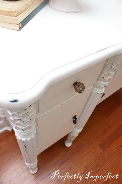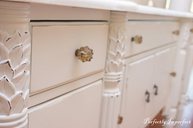 When I saw the piece, I knew I wanted to add some color to the hardware to avoid too much “sweetness and romance.”  I found these anthropologie-inspired amber glass knobs at Hobby Lobby 50% and I knew they’d be perfect.  I bought enough for the entire piece, but I loved the original drop pulls and I hoped the girls would let me mix them up.