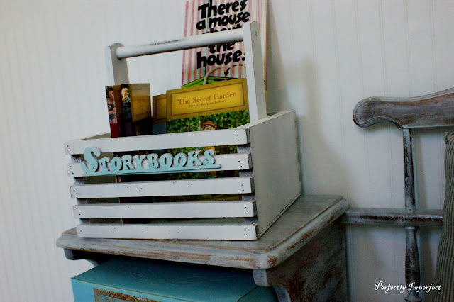 I primed it, painted it with Krylon’s Bright White Satin, and slightly distressed it. “Storybooks” is painted with a blue acrylic.