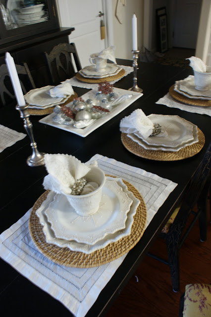 I adore your snowflakes dishes. Gorgeous – I'd also love to know who makes them. I love them with your rattan chargers.