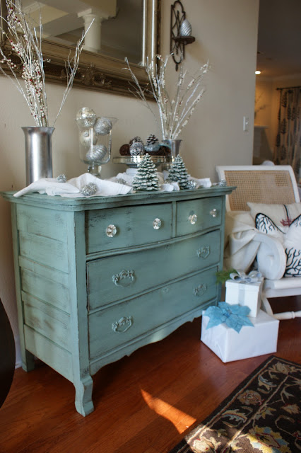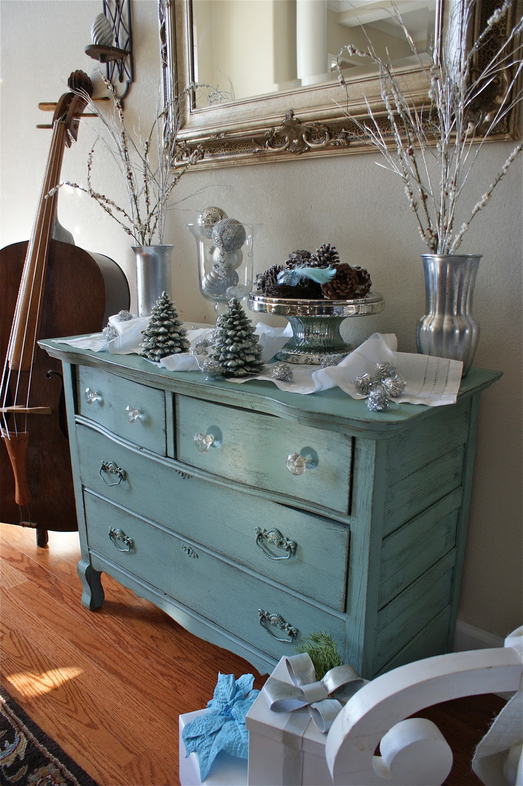 Love your Christmas vignette … the silver/whites popping against your beautiful blue chest is amazing. Thanks so much for hosting! *Becca*