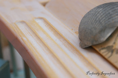 I do love the way it looks like I just left it outside for a long time. First, I watered down my latex paint with water….then washed a coat on the bottom half. After painting all those dowels, I decided I was nuts. So when it dried, I spray painted the bottom half a turquoise that will match the wall color. After it dried, I used a 320 grit sanding block to age it and thin the paint.