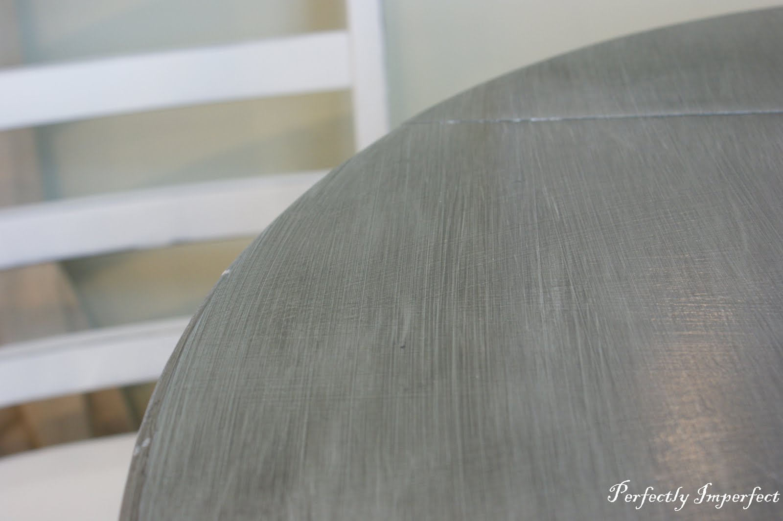 The zinc would have been too much for the table and chairs, so I did them in a really flat, chalky white and distressed the edges and seats. The whole room had this green, white and metallic vibe and I think the new table blends well now.