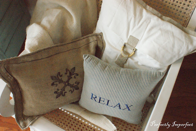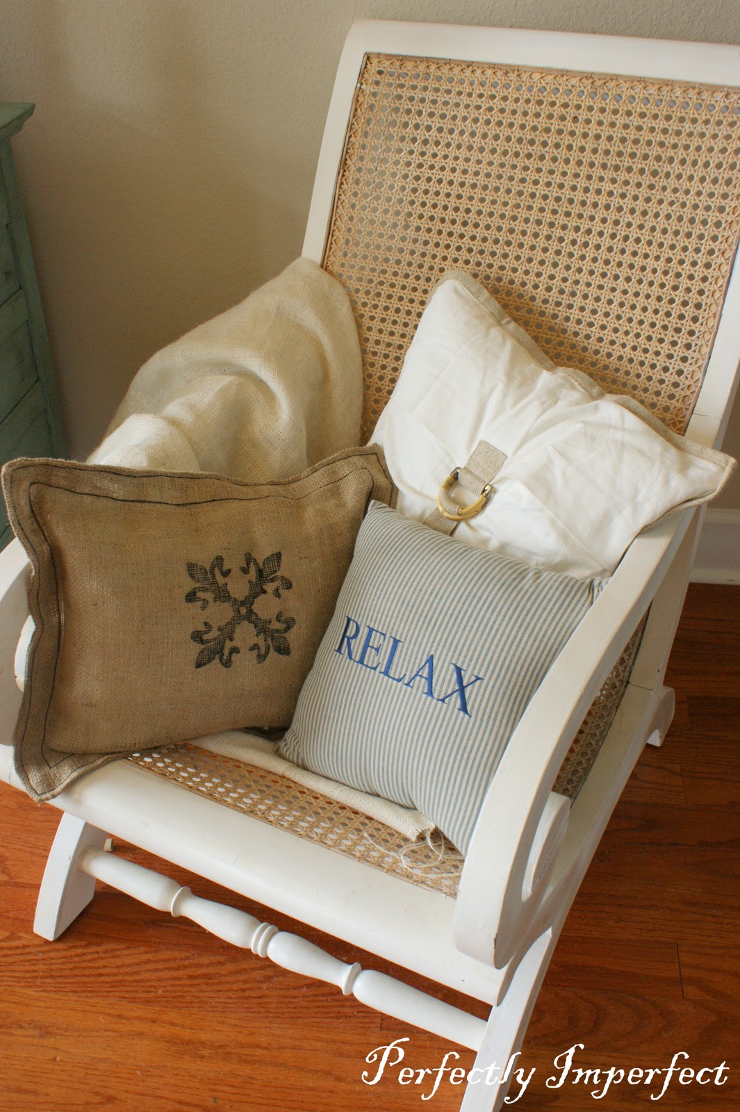 I found the burlap stenciled pillow at my favorite antique and flea market, Eastbrook in Montgomery, and the “relax” at TJ Maxx.  The pottery barn bamboo buckled pillow was one of my only ebay wins.