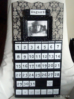 I know I may be partial to the furniture redos, but this one was just too good to pass up!  🙂  And I know I have passed up a billion of these perpetual calendars at thrifts stores and such, and now I wish I hadn’t!!  Over at The Thrifty Tickle, they took a sad calendar that took a time-warp from 1985 and made it totally current and modern with a type-face font and the black and white damask!  There’s even a little picture frame you can change out!  Genius!  I want one!!  🙂