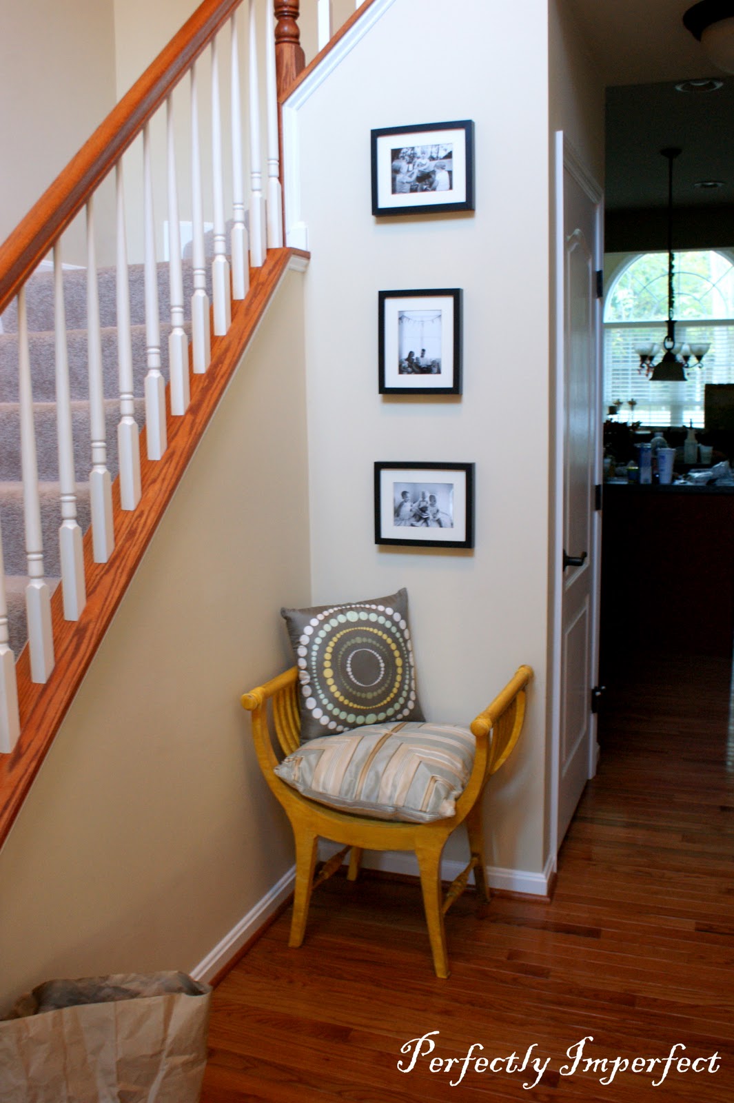 I love these lines, and the comfy seat…so very Lisa. She had plans to paint her entry wall a deep teal (not very unlike her living room wall), so I suggested some yellow and gray accent colors.