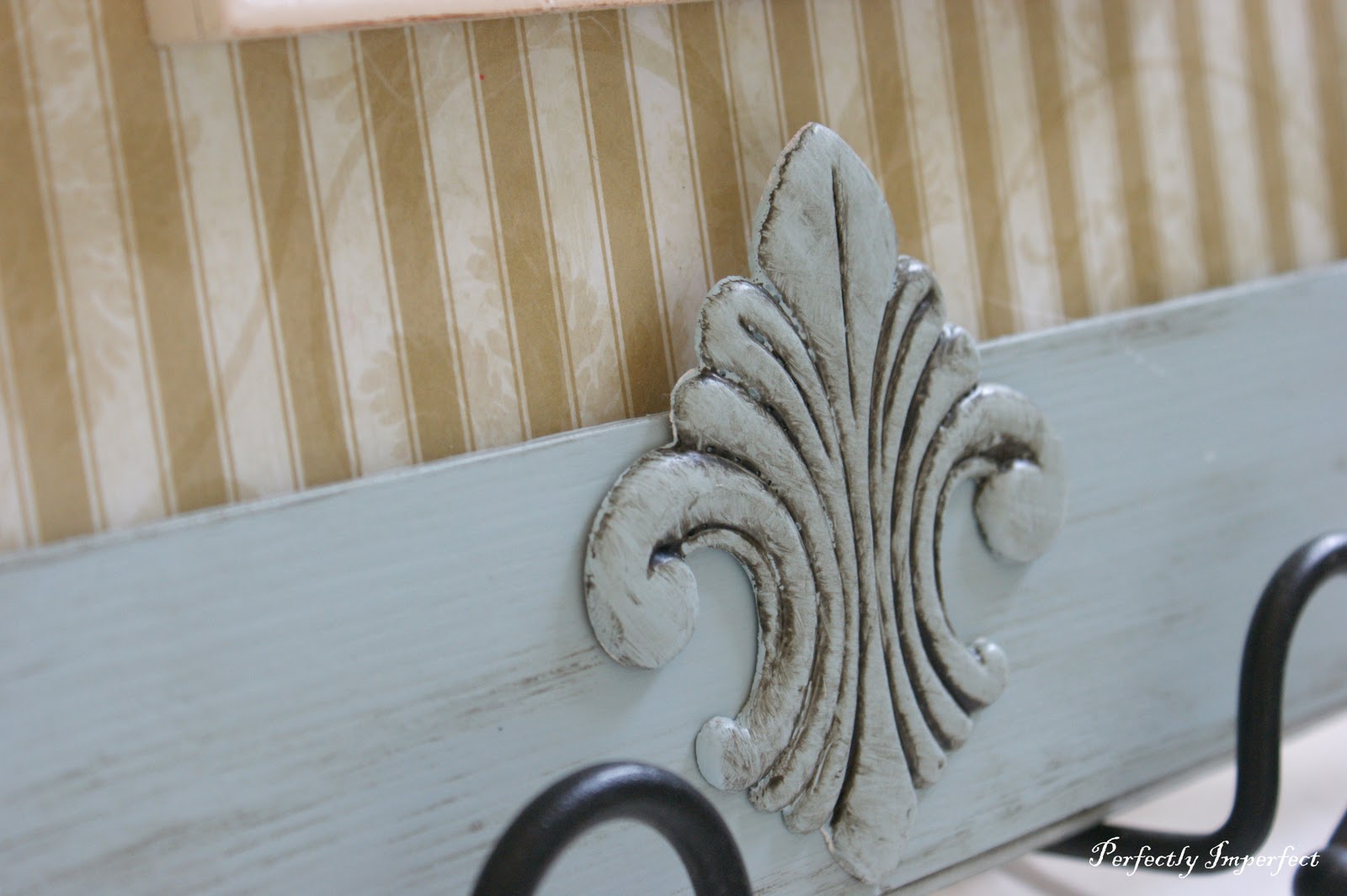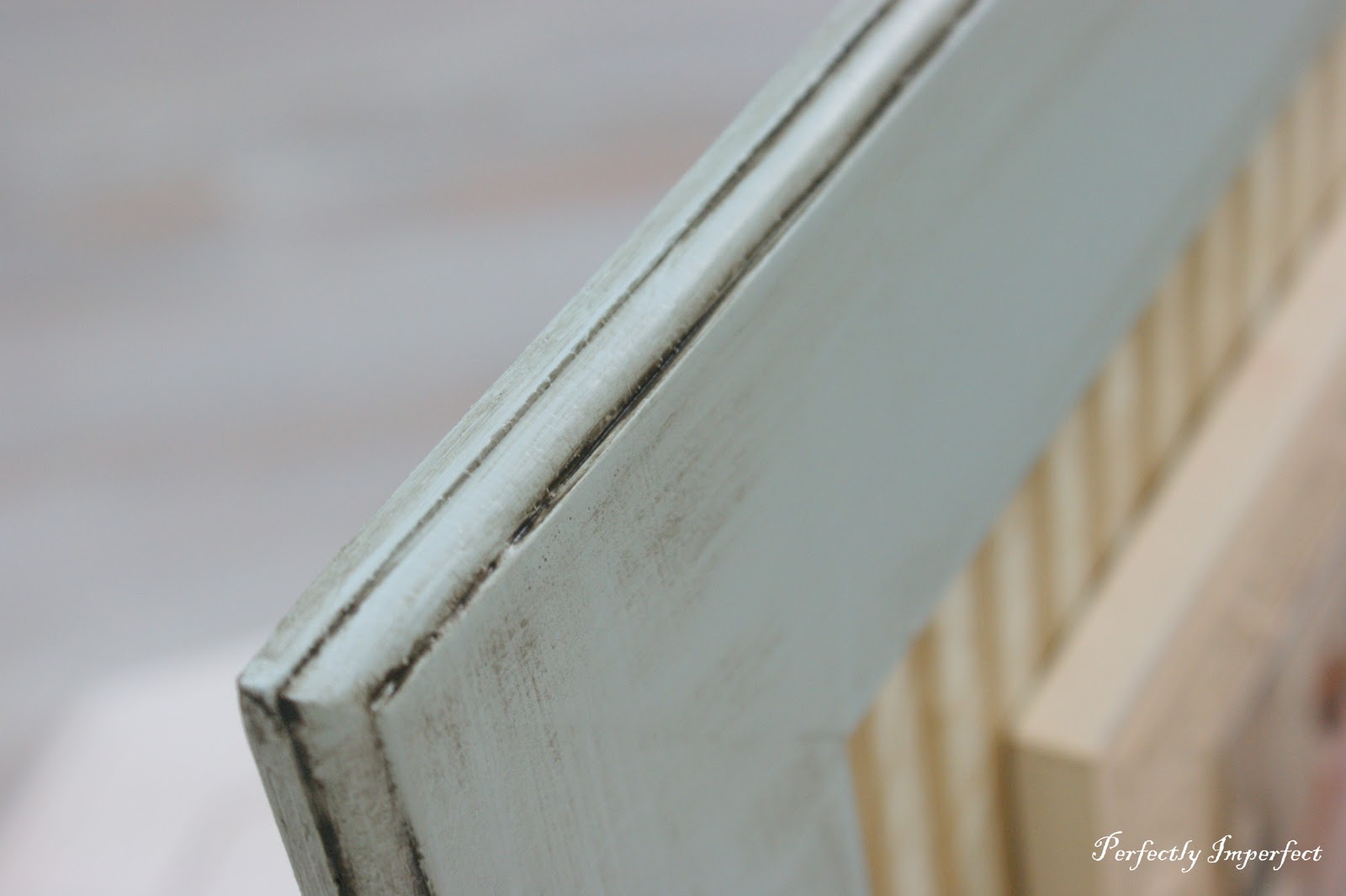 I painted mine with paint left from our guest bedroom, Valspar’s Misty Surf (plus 2 extra pumps white). I then glazed it with Valspar’s Antiquing Glaze (my favorite!). You’ll want to seal it with a clear acrylic matte sealer too.