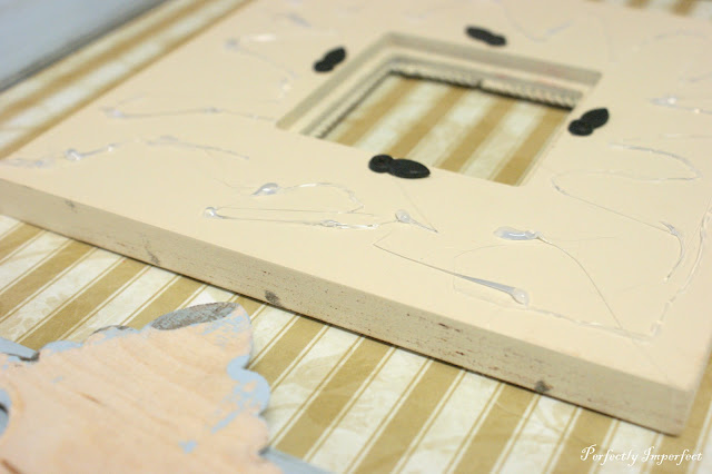 I used a hot glue gun to attach my frame to the “mat.” You’re probably going to apply it before it gets this dry. Because I pretty much had to scrape all this off and skipped the photographing the next time.