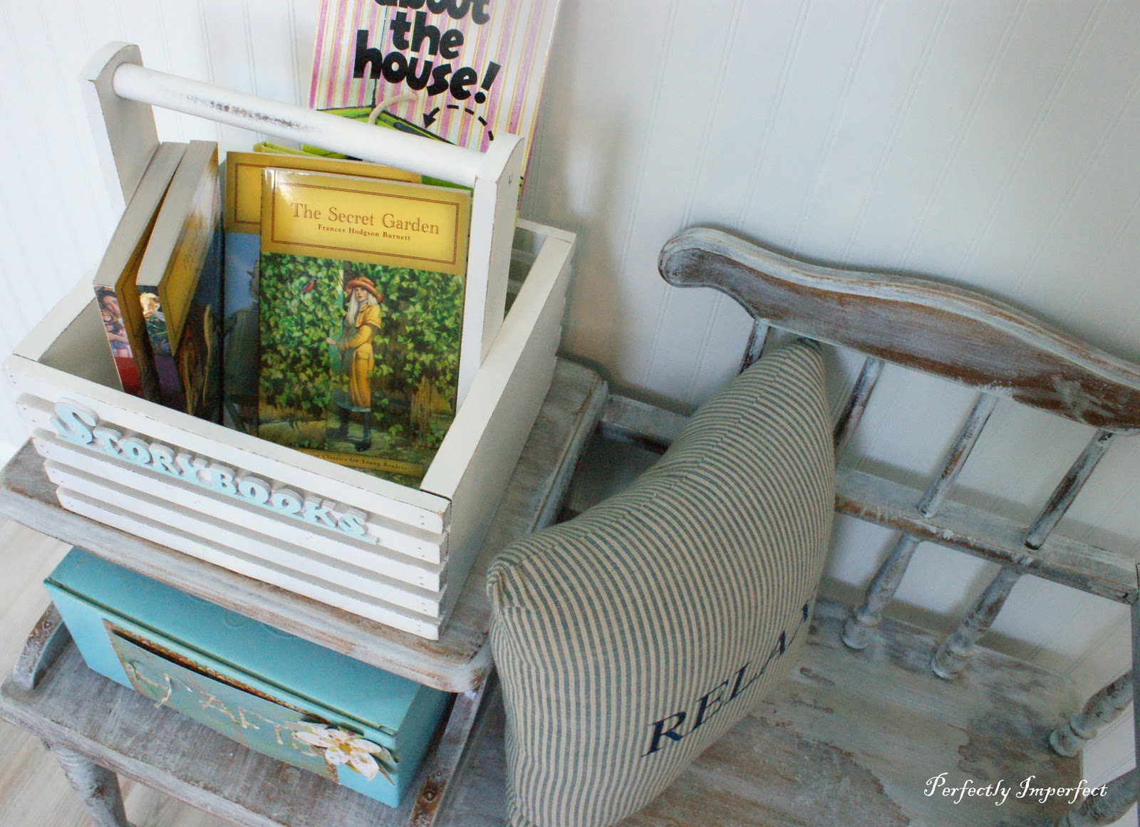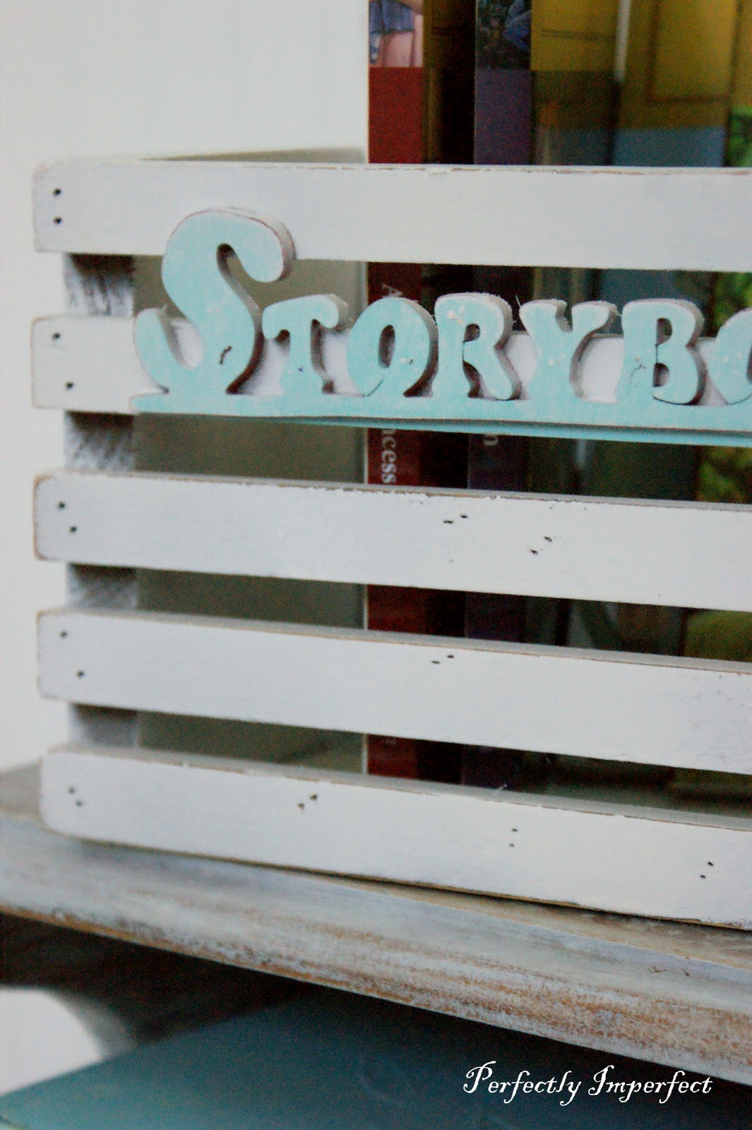 I primed it, painted it with Krylon’s Bright White Satin, and slightly distressed it. “Storybooks” is painted with a blue acrylic.