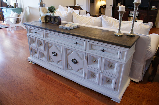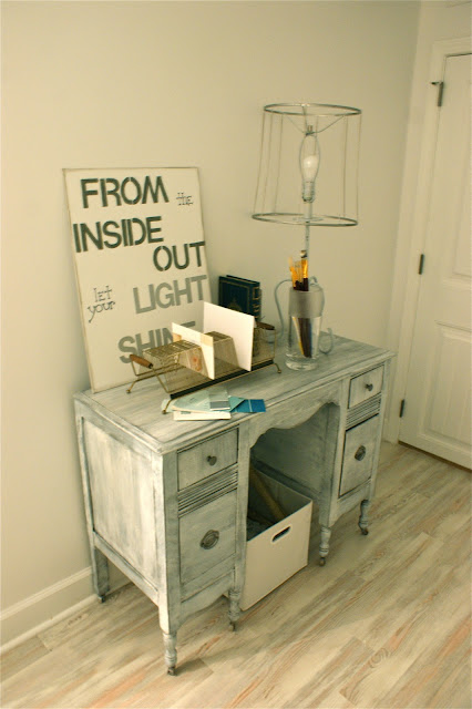 Since I’ve not sold it yet, the white aged antique vanity was moved behind my desk to give me just a little more storage and work space. (I’m realizing now I’ve never posted that subway art or the ghost lamp re-do!)