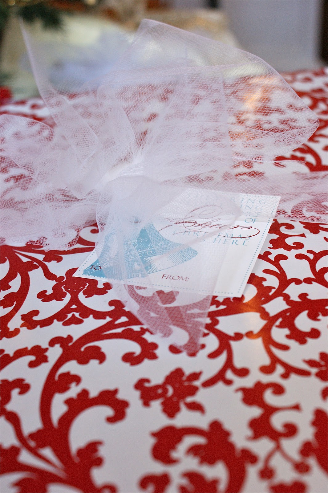 I am loving that crown/script gift wrap, Shaunna! I usually wind up with left over gift wrap and then I always pick up a roll or two on clearance, so I will use different papers for my sister and her family; then another paper for my brother and his wife; and so on. I totally agree with just making an area for your mess! I usually use my dining room table, but this year I kept it totally out of the way and used the pool table in our great room {covered, of coure}. It worked out great! Have a very Merry Christmas!