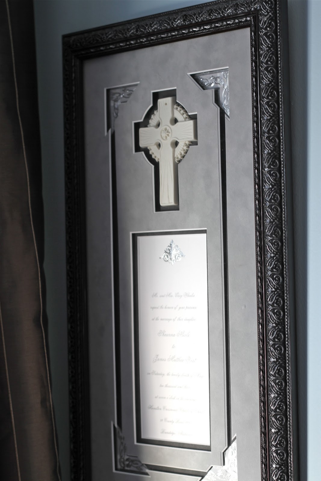 This is a framed version of our wedding invitation and was a gift to us…it’s so very special and it fits in here nicely. It’s such an interesting interpretation of the actual invite…the “corners” are the actual ribbon from the inner envelope.