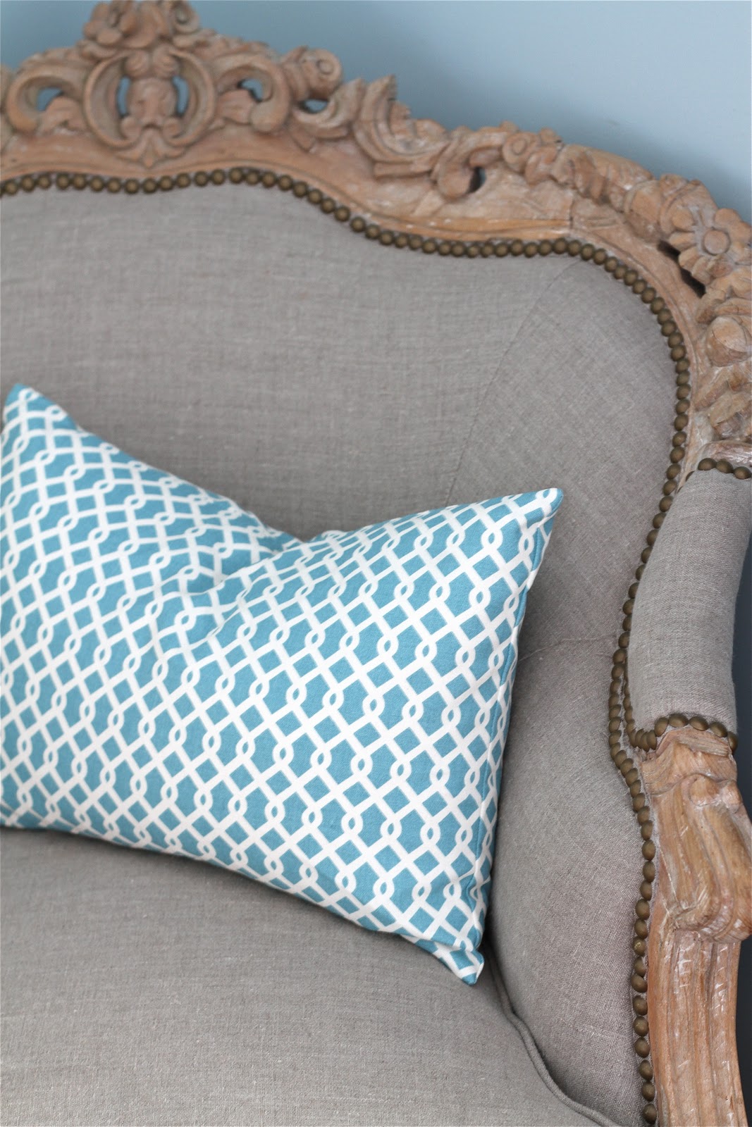 And the French chair, the love of my life. I’m still working on getting it into my living room or master somehow….I need to see it everyday. The little pillow was sewn from 1/2 yard of fabric….Waverly Trellis in turquoise. ($12 a yard)