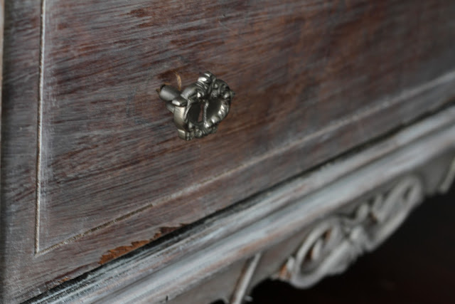 I did keep the original hardware on the wisteria-inspired chest, but only on the three small drawers in the center.