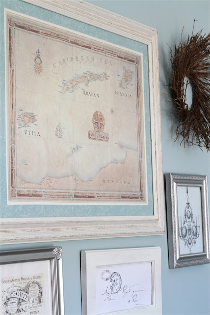 The wall collage is made from meaningful prints and textures…the framed map is one we bought while we were in the Bay Islands of Honduras.