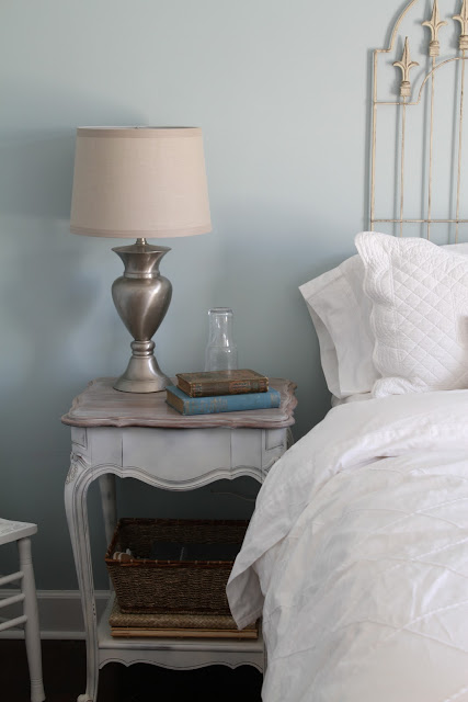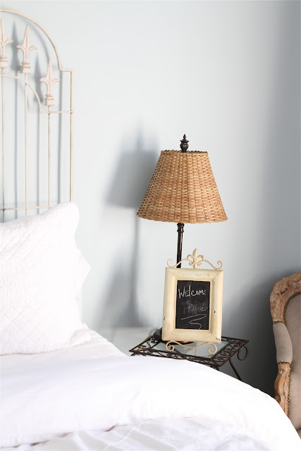 The lamp on the opposite side of the bed is the result of mixing the sea grass shade with another base. Both of these came from other rooms in the house.
