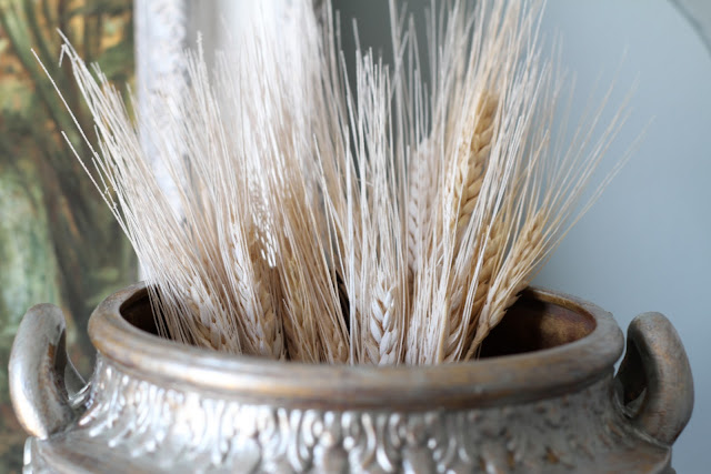 I painted this little urn I already had with some DecoArt metallic paint….I believe the color was Silver Sage. I just brushed it over the gold so it peeked through a bit. I also took some reeds I had in a craft bag and sprayed them with a little white to ease some of the yellow.