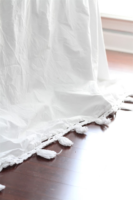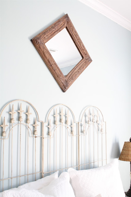 The headboard….I love the headboard. It’s so light and airy, yet it draws my eye upward to the high ceilings. I found these salvaged trellis pieces at our local antique shop…which I LOVE…it’s the perfect blend of antique mall and flea market. They were $18 each, making the headboard $54.