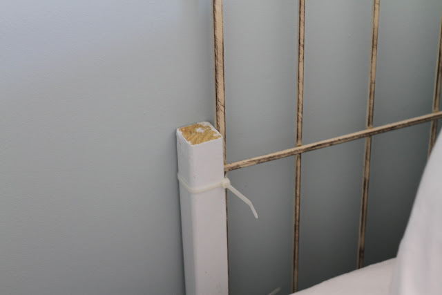 Want to see how we’ve got this headboard rigged up? We have the pieces zip-tied to four spindles we had lying in our garage.